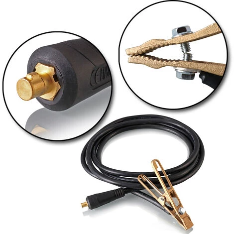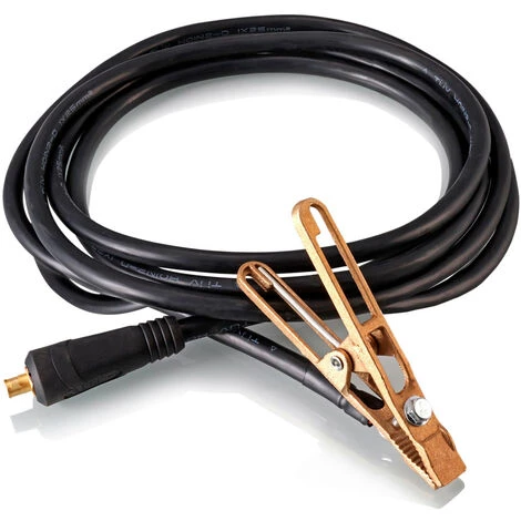 - Das Masse-Schweißkabel ist 3 Meter lang und komplett mit Stecker und Masseklemme montiert.