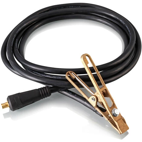 Das Schweißkabel ist komplett mit einem Stecker und einer Masseklemme montiert. Die Masseklemme ist kupfergeflochten und besteht aus kräftigen Spannbacken sowie starker Federhebel, wodurch ein Werkstückkontakt hergestellt wird.