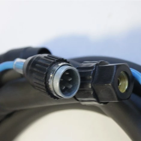 Der TRAFIMET SR 26 WIG-Brenner kommt mit einem 4 m langem Schlauchpaket. Das Schlauchpaket ist passend für die TECHNOLIT WIG-Top 200 AC/DC Schweißanlage. Der Stecker ist ein 5-poliger Tuchelstecker. Der Brenner besitzt ein Kugelgelenk. Damit schweißen Sie auch an schwer zugänglich Stellen. Der Schlauch ist am oberen Drittel mit einem Lederbezug versehen. Dadurch wird das Schlauchpaket geschont und seine Lebensdauer verlängert sich spürbar. Die Brennerkappe ist lang. Die Keramikdüse hat die Größe 7. Die Spannhülse und das Spannhülsengehäuse haben einen Ø von 2,4 mm.